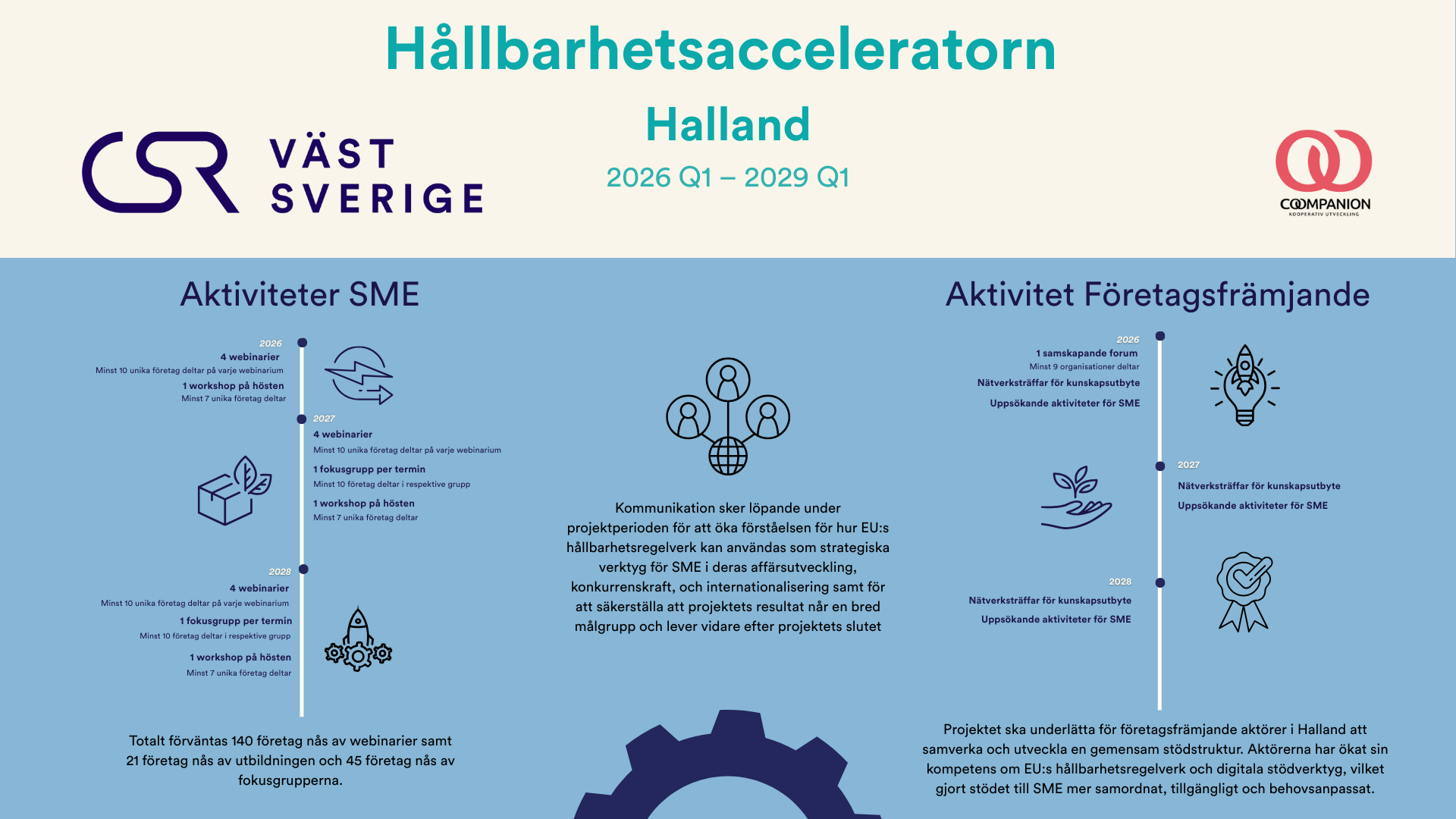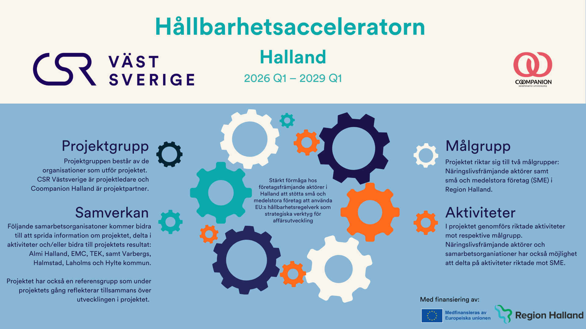 Ett långsiktigt treårigt arbete där vi tillsammans med våra partners i Halland stärker både företagens förmåga och stödsystemets kapacitet för att accelerera den hållbara omställningen.
