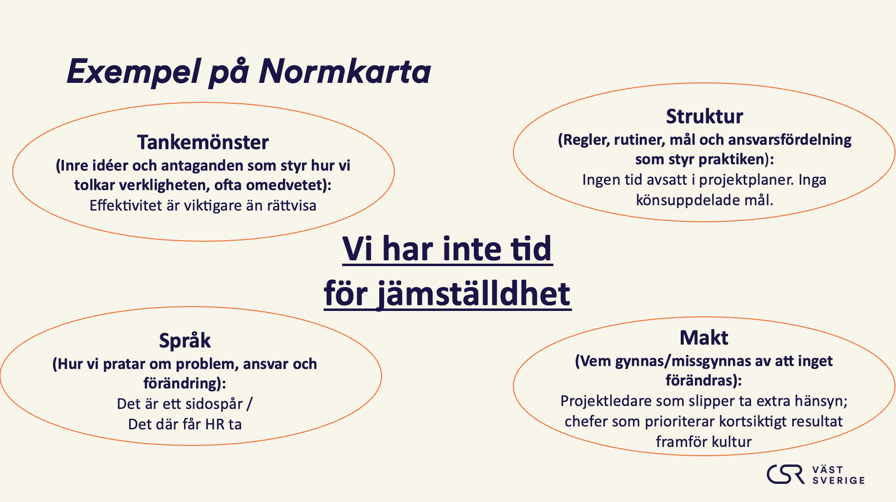 - Tankemönster – Jämställdhet betraktas som något frikopplat från kärnverksamheten.